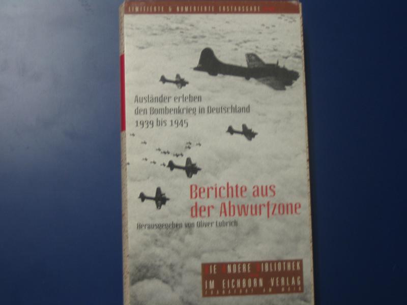 Berichte aus der Abwurfzone. Ausländer erleben den Bombenkrieg in Deutschland 1939 bis 1945, herausgegeben und mit einer Einleitung versehen von Oliver Lubrich. Gebunden. Cassette. Limitierte & Numerierte Erstausgabe. (6180). "Die andere Bibliothek" im Eichborn Verlag. Frankfurt/Main. 2007. Neu, kein Schutzumschlag, gutes Leseexemplar. ISBN 9783821845838.
